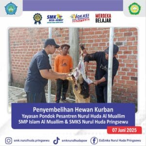 Pringsewu, 07-06-2025. Memperingati Hari Raya Iduladha 1446 Hijriyah, SMK Nurul Huda menggelar penyembelihan hewan qurban sebagai wujud kepedulian dan keikhlasan dalam berbagi. Kegiatan ini melibatkan partisipasi aktif siswa, guru, serta warga sekolah, sekaligus menjadi sarana edukasi tentang makna ibadah qurban.